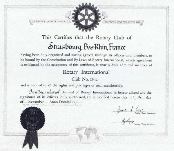 Au moment de l'évacuation de Strasbourg en 1939, il fut placé dans un coffre dans un appartement situé à l'ESCA rue des Pontonniers. A la libération, un capitaine de l'armée de Patton, Jack Byrnes, fut chargé de recueillir des documents laissés par les troupes allemandes lors de leur évacuation de Strasbourg. Les recherches le menèrent dans le bâtiment de l'ESCA devant le coffre-fort fermé dont il fit sauter les serrures. Il y découvrit le fanion du club de Strasbourg. Il l'emporta, ayant pour intention de le restituer au club. Mais l'armée américaine quitta Strasbourg avant que le club ne fut réinstallé et ainsi le fanion prit part au combat en Allemagne et se retrouva à la fin des hostilités aux USA, toujours aux mains du capitaine Byrnes qui, démobilisé, revint à la vie civile tout en conservant soigneusement le fanion. Devenu rotarien au club de Marlborough (Massachusetts), il remit le fanion à son Président nominé Ralph G. Anderson qui devait participer à la Convention Internationale du Rotary qui se tenait en 1957 à Lucerne. Il y trouva deux représentants de notre club : E.O.Meyer et Paul Metzger. Il leur remit le fanion le 21 Mai 1957 en racontant son odyssée et en exprimant le plaisir qu'il avait à mettre fin à ce périple pour le moins étonnant.