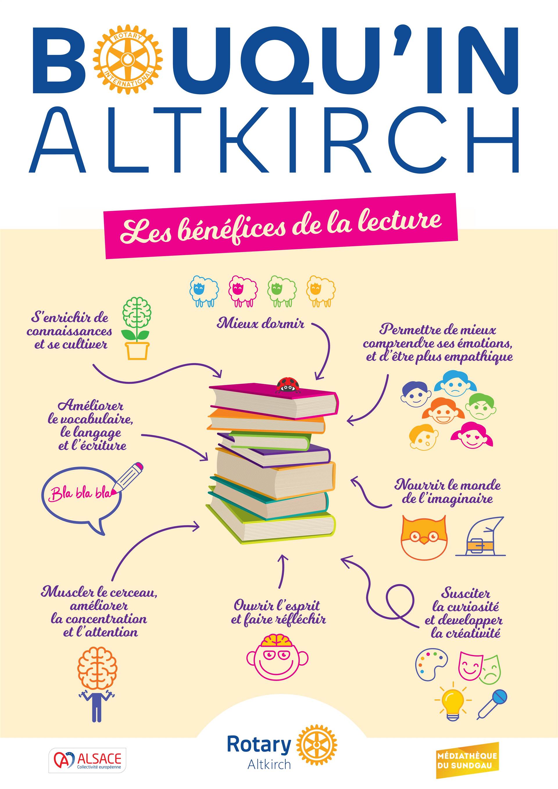 Fort de sa devise Servir d’abord et porté par les valeurs humanitaires du Rotary international, notamment celles d’agir pour la jeunesse, l’éducation et l’environnement, le Rotary Club d’Altkirch organise en partenariat avec la Collectivité européenne d’Alsace et la médiathèque du Sundgau, une « vente solidaire de livres d’occasion » destinée à la jeunesse, de 0 à 15 ans.