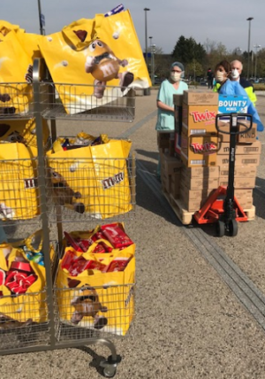 Quelques jours plus tard, grâce à nos contacts, la société Mars Alimentaire adhère immédiatement à notre projet et organise deux livraisons de palettes de 300 kg de barres chocolatées à Hautepierre et au NHC.