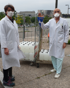 Des membres du Rotary Club Strasbourg identifient des sources d’approvisionnement fiables pour des masques lavables et des bidons de gel hydroalcoolique. Le personnel de la réanimation de l’hôpital de Hautepierre nous fait une commande groupée.